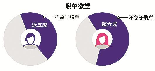 調查顯示,在脫單欲望方面,近五成單身男性和六成單身女性表示不急于改變單身狀態(tài)??梢?,單身男女的脫單欲望正在逐漸下降。
