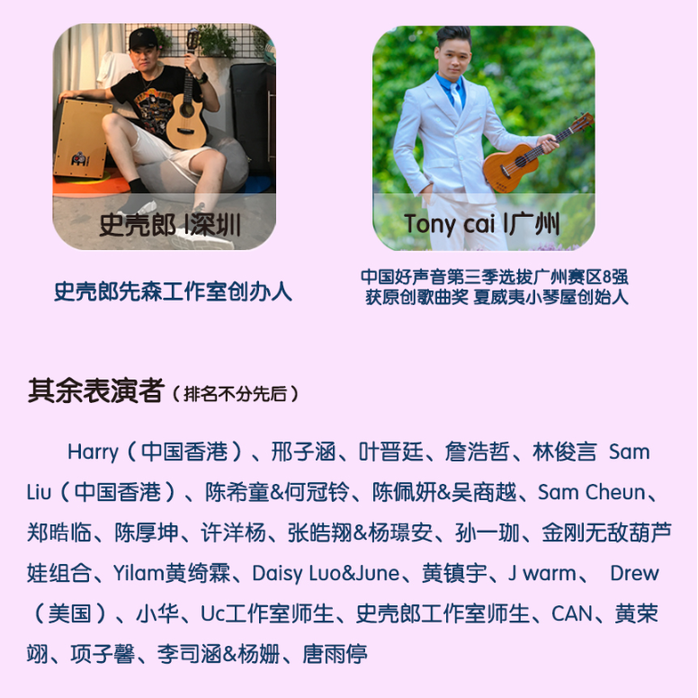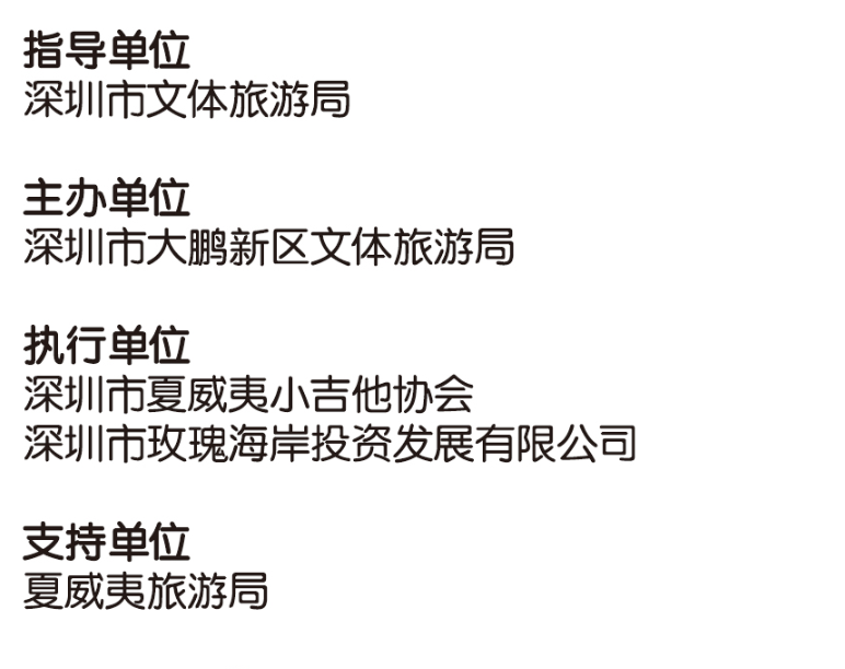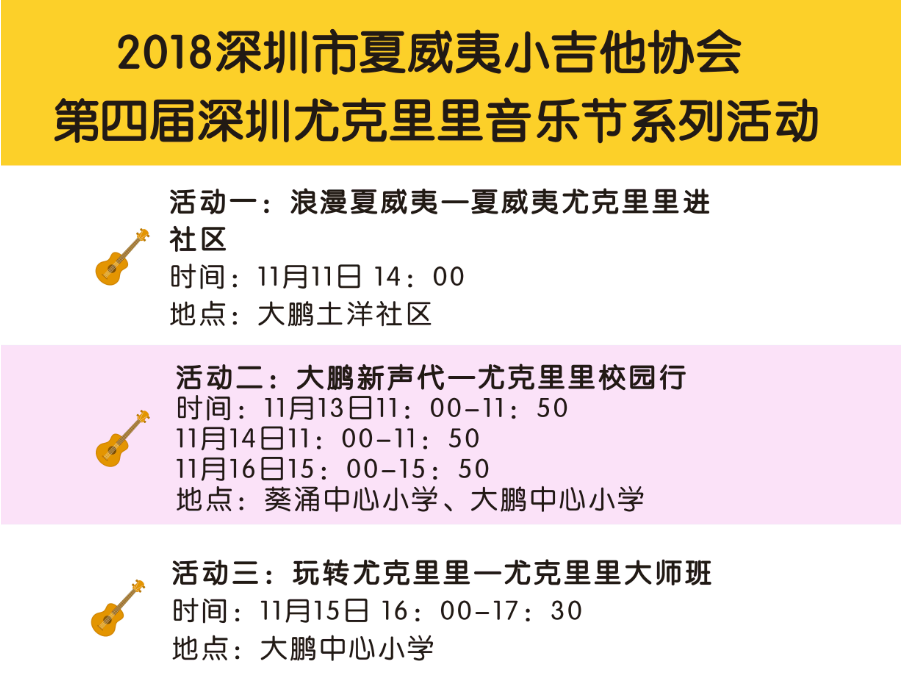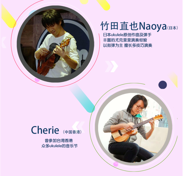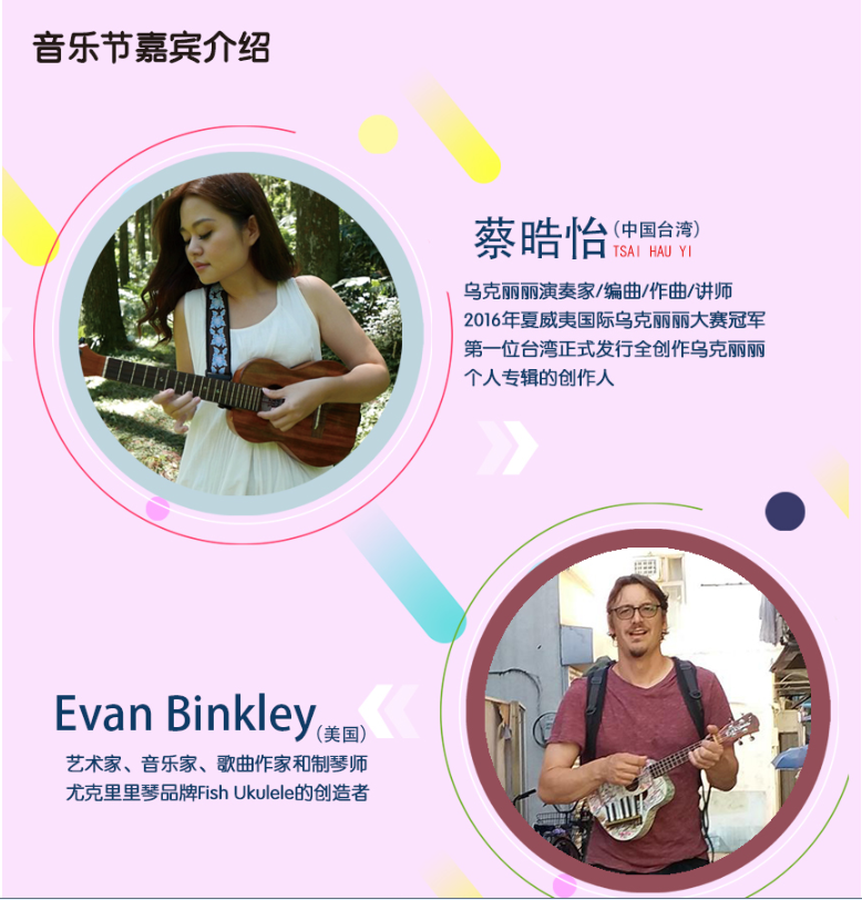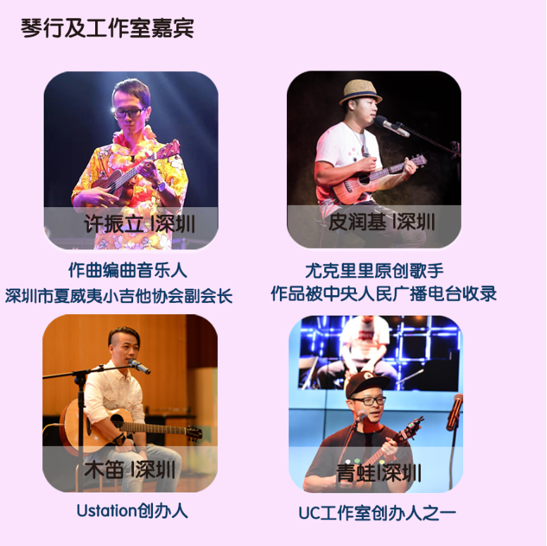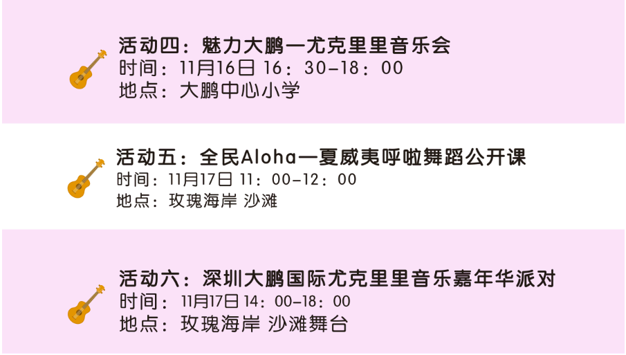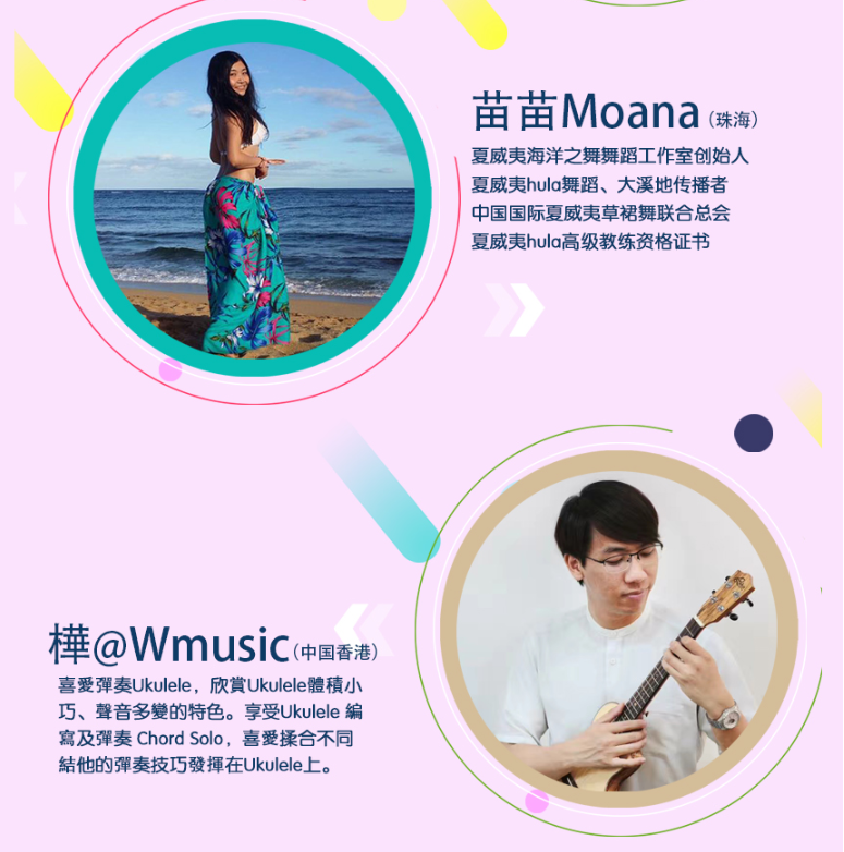 其中全民參與嘉年華音樂會11月17日的將會在深圳市玫瑰海岸沙灘舉辦,有深圳、香港(中國)、臺灣(中國)、美國、日本、廣州、中山、珠海等地的嘉賓和愛好者近50組表演者帶來4小時(shí)尤克里里盛會,表演者年齡跨度更是從5歲到60歲。嘉年華現(xiàn)場除了尤克里里音樂會,還將有Moana夏威夷呼拉舞風(fēng)情體驗(yàn),中國臺灣尤克里里協(xié)會會長陳建廷新書《兒童尤克里里英文暢游》深圳首發(fā),中國臺灣尤克里里世界大賽冠軍蔡皓怡原創(chuàng)專輯《航海日志》深圳首發(fā),以及美國尤克里里音樂家、藝術(shù)家新專輯《粉色海豚》尤克里里專輯中國大陸首發(fā)。