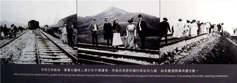 左邊第一張圖為1911年10月15日九廣鐵路全線通車(chē)現(xiàn)場(chǎng),右邊兩張圖為參加通車(chē)典禮的中英嘉賓的活動(dòng)場(chǎng)景