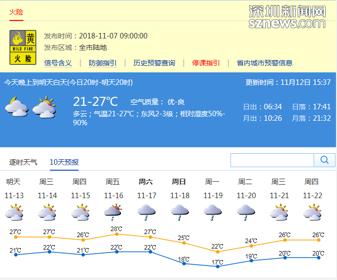 記者從深圳市氣象局了解到,11日夜間到12日白天,深圳市多云間陰天;早晨最低氣溫22-23℃,東部及山地地區(qū)氣溫會低1-2℃;白天最高氣溫在28-30℃;相對濕度在45%-95%;偏北風(fēng)2-3級,沿海和高地最大陣風(fēng)4-5級;全市能見度普遍在5-15公里左右。火險預(yù)警信號生效中。