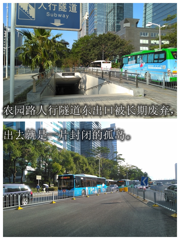 自2017年連通深南大道兩側,可供行人通行的人行天橋被拆卸后,行人都只能從人行隧道過街。但奇怪的是,人行隧道的東出口處是一片被隔離、被荒廢的“孤島”,這讓需要從此出口通行的市民很尷尬。即使避開這個出口,選擇繞行,又容易在農園路口與右轉車輛發(fā)生沖突?!罢娴暮転殡y我們啊?!笔忻駞窍壬C實了步行通過該路段的“艱難”。