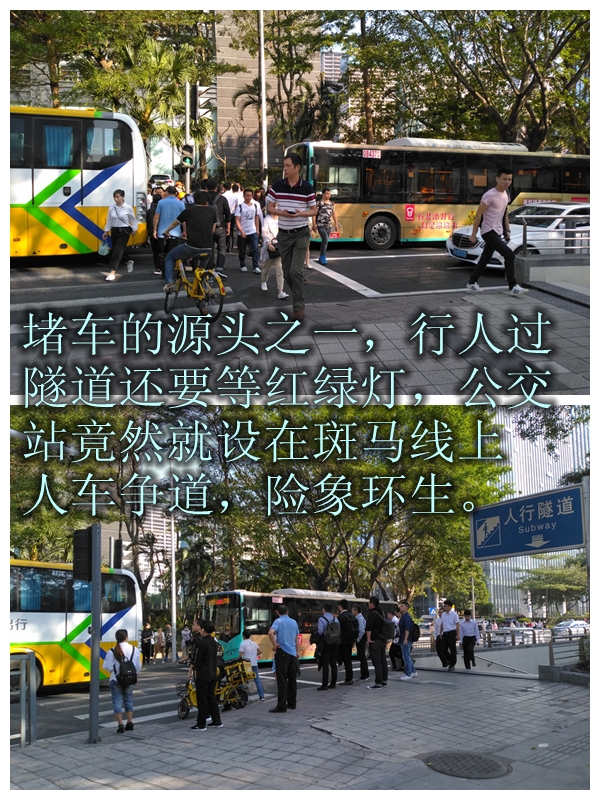 而在進入人行隧道前,又需要等紅綠燈,且公交車站就設在這紅綠燈前的斑馬線上。“我不明白為何在交通這樣混亂的地方,要設置公交車站,也不知為何‘為難’的都是市民。”網友“深圳大胡子”為這里每天通行的行人鳴不平,他希望能把招商銀行公交站原來的港灣式站臺恢復,方便市民乘車,也希望能盡快恢復正常的過街通道。
