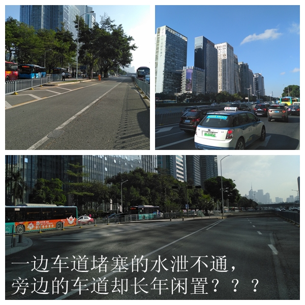 一邊是擁堵不堪的狹小道路,一邊是長年閑置的車道,網友在公交車上看著旁邊空空如也的馬路,手表走過該打卡的點,他又遲到了。