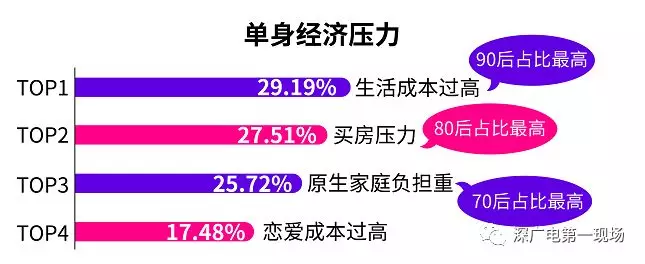 脫單難點中的經(jīng)濟壓力層面分析發(fā)現(xiàn),生活成本過高是影響脫單的最大單身壓力,其次是買房壓力,原生家庭負擔重以及戀愛成本過高。