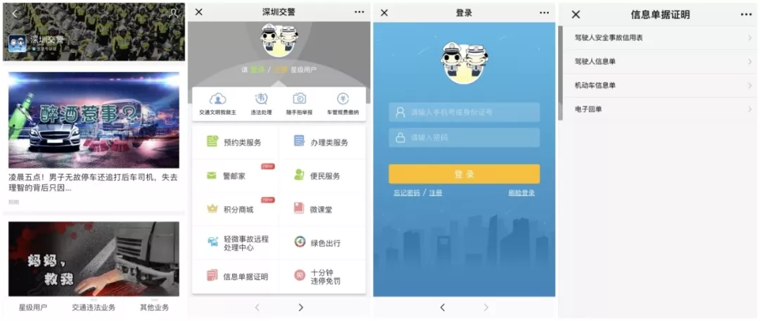 搜索公眾號“深圳交警” →登錄星級用戶 →選擇“信息單據(jù)證明” →選擇需要打印的證明類型