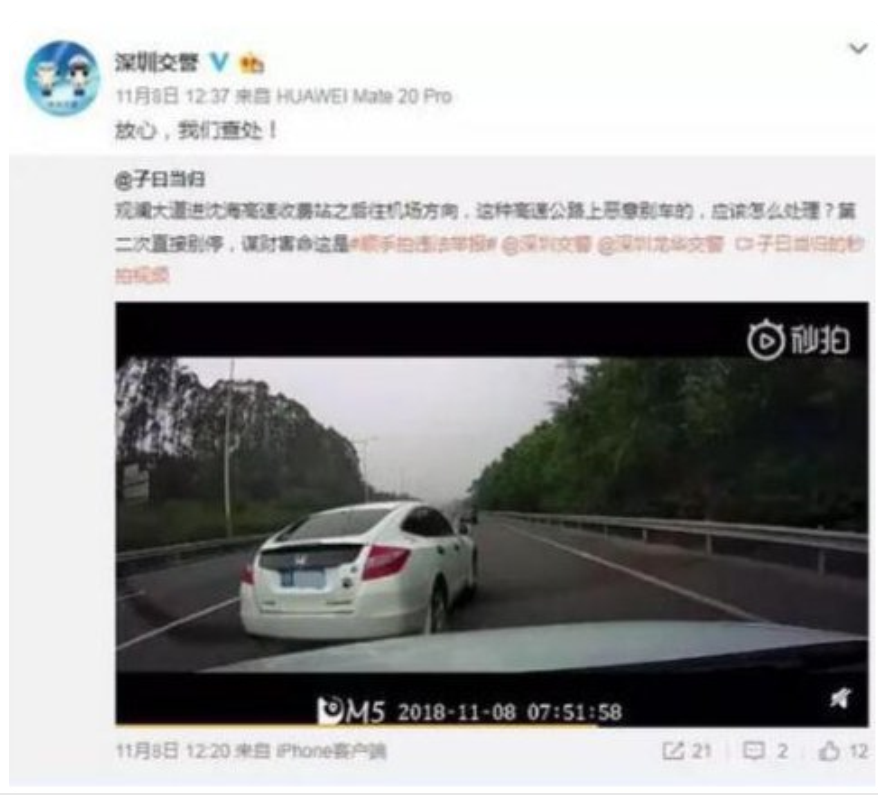 目前,深圳交警對(duì)舉報(bào)人(出租車司機(jī))變線不使用轉(zhuǎn)向燈,影響其他車輛正常行駛的違法行為依法做出處罰;對(duì)被舉報(bào)人(大巴司機(jī))處以5天行政拘留。