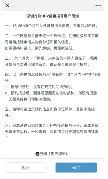 值得注意的是,九價HPV疫苗搖號沒有深圳戶籍限制。不過,一個微信號只能綁定一個身份證。注冊時必須實(shí)名填寫疫苗接種申請人的身份證和相關(guān)信息。