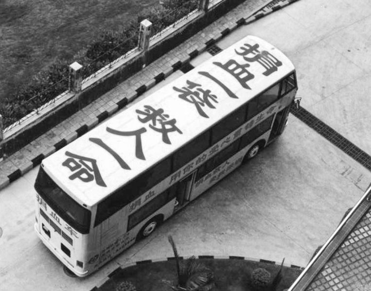 1995年5月7日,捐血車第一天開上街頭,血站老站長楊春森拿著擴音器大嗽叭向市民宣傳。 余海蓉 攝