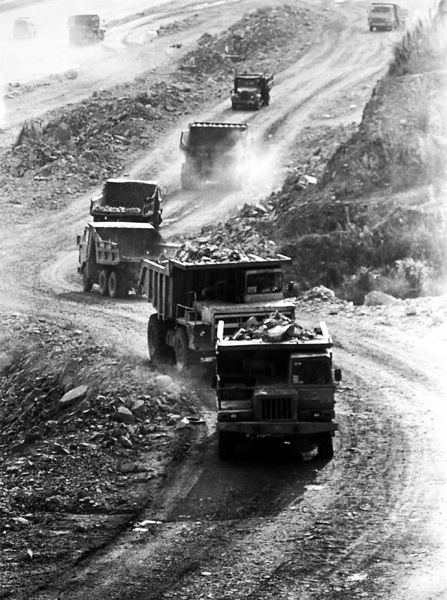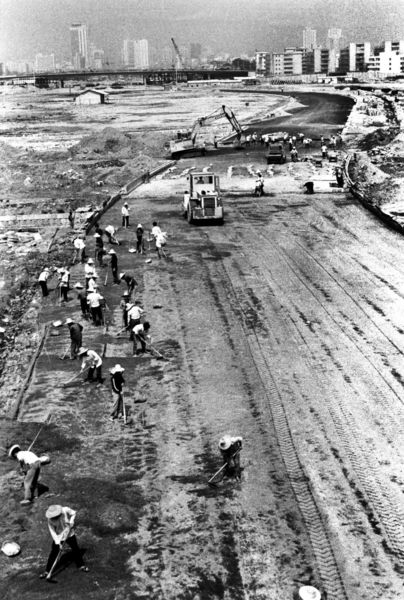 1994年,修建濱海大道時(shí)泥頭車(chē)運(yùn)泥填海。鄭東升 攝