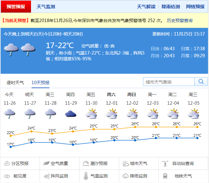 深圳新聞網(wǎng)11月26日訊(記者 施冰冰) 記者從深圳市氣象臺了解到今天陰天,間中有小雨,氣溫17℃-22℃;周二到周四以陰天為主,間中有分散小雨;周五到周日多云,可見陽光,氣溫回升。