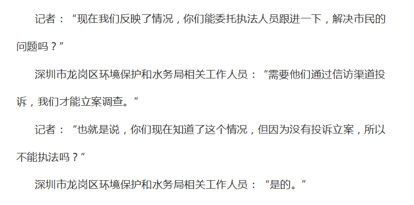 以下是記者與深圳市龍崗區(qū)環(huán)境保護(hù)和水務(wù)局信訪部門(mén)工作人員的部分對(duì)話: