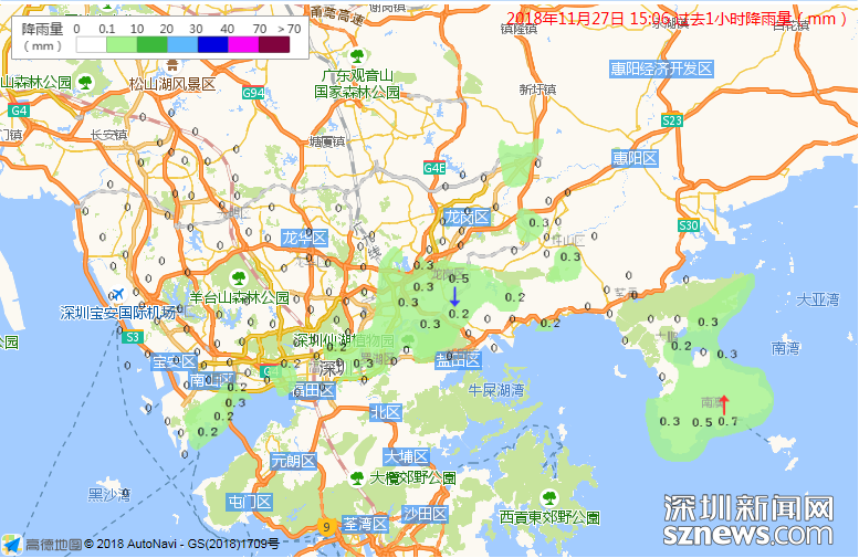 市氣象局監(jiān)測(cè)過(guò)去1小時(shí)降雨量(數(shù)據(jù)更新于11月27日15時(shí)06分)