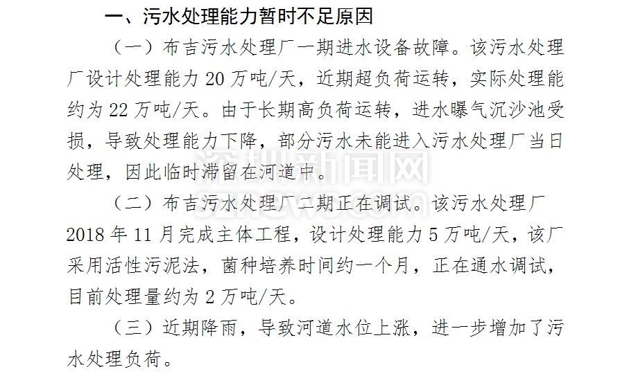 在其復(fù)函中,明確說(shuō)明了河道黑臭的原因主要為該片區(qū)污水處理能力暫時(shí)不足(片區(qū)污水產(chǎn)生量約為26萬(wàn)噸/天,目前實(shí)際污水處理量約為24萬(wàn)噸/天),為防止生活污水直排下游,臨時(shí)設(shè)置橡膠壩,生活污水臨時(shí)滯留河道所致。