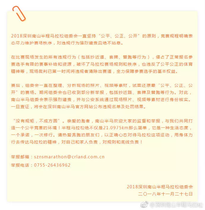 27日,南山半馬賽事組委會(huì)通過(guò)微博發(fā)布聲明稱,在比賽現(xiàn)場(chǎng)發(fā)生的所有違規(guī)行為,侵占了正常報(bào)名參賽選手有限的賽事補(bǔ)給和資源,破壞了馬拉松賽場(chǎng)規(guī)則和秩序,也違反了公平公正的體育精神等,現(xiàn)場(chǎng)裁判已第一時(shí)間將違規(guī)者清除出賽道,全力保障參賽選手的基本權(quán)益。