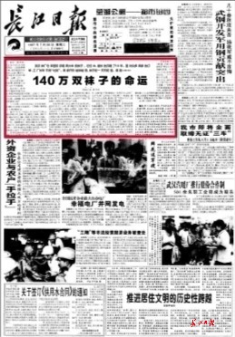 《140萬(wàn)雙襪子的命運(yùn)》于1997年7月30日首發(fā)于長(zhǎng)江日?qǐng)?bào)一版,獨(dú)家報(bào)道了武漢襪廠倉(cāng)庫(kù)里積存了兩火車皮襪子,其中最長(zhǎng)的沉睡了10年,但是面對(duì)眾多商家訂單,工廠卻長(zhǎng)年不肯“吐貨”,商家開價(jià)越來(lái)越低,襪子在一天天貶值。此報(bào)道一出,轟動(dòng)全國(guó),多家媒體轉(zhuǎn)載,并獲得第八屆中國(guó)新聞獎(jiǎng)一等獎(jiǎng)。