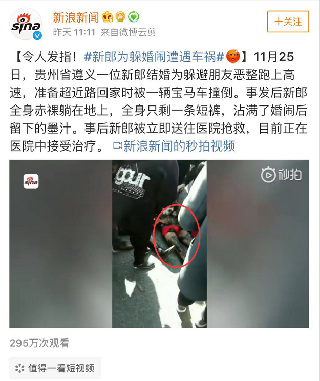 事發(fā)后,新郎全身赤裸,只剩一條短褲,沾滿了婚鬧后留下的墨汁。