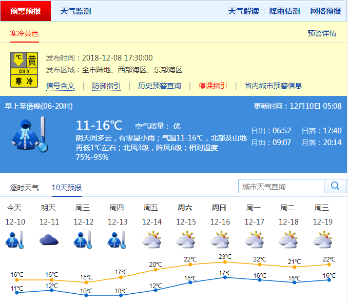 深圳新聞網(wǎng)12月10日訊(記者 施冰冰)據(jù)了解,受冷空氣補(bǔ)充影響,深圳10日陰天間多云,偶有零星小雨,早晨最低氣溫10-11℃,天氣陰冷;11日云量較多,日溫差??;12-13日新一股冷空氣影響,多云可見陽光,最低氣溫將降至10℃或以下;14日冷空氣減弱,氣溫回升。預(yù)計寒冷黃色預(yù)警信號將持續(xù)至13日前后。