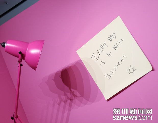 Anglepoise是英國經典的臺燈設計,Paul Smith先生以他的英式幽默,將它依比例放大成巨型臺燈,并涂上了展覽主色系的粉紅色,背景再加上 Paul Smith先生最喜愛的便利貼 EVERY DAY IS A NEW BEGINNING,在展覽出口作為對每位觀眾最后的謝禮。