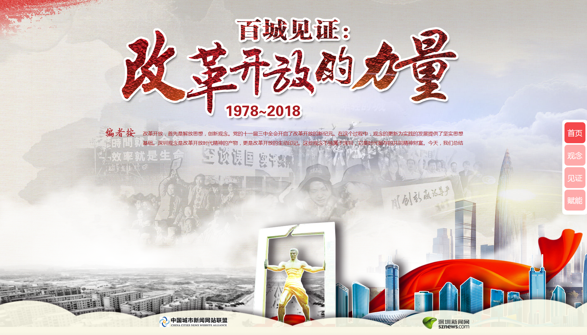 此次活動(dòng)由中國城市新聞網(wǎng)站聯(lián)盟主辦,深圳新聞網(wǎng)承辦,活動(dòng)在今年10月中國城市新聞網(wǎng)站聯(lián)盟總編輯聯(lián)席會(huì)上正式啟動(dòng)。專題網(wǎng)頁采用全新H5技術(shù),用歷史原圖、視頻、音頻和文字交互呈現(xiàn)方式,詮釋改革、實(shí)干、擔(dān)當(dāng)、文明、開放、創(chuàng)新等深入民心的改革開放觀念,并發(fā)動(dòng)網(wǎng)盟近百家成員單位網(wǎng)站,深入挖掘當(dāng)?shù)爻鞘懈母镩_放的生動(dòng)案例和故事,報(bào)道這些代表性觀念對(duì)所在城市發(fā)展的巨大影響,共同描繪改革開放40年的生動(dòng)畫卷。
