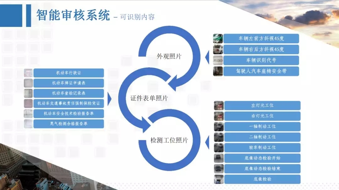 可識別車檢過程中的全部圖片、視頻及文字材料, 包含外觀照片、工位視頻,證件表單3大版塊共18項(xiàng)檢測內(nèi)容。