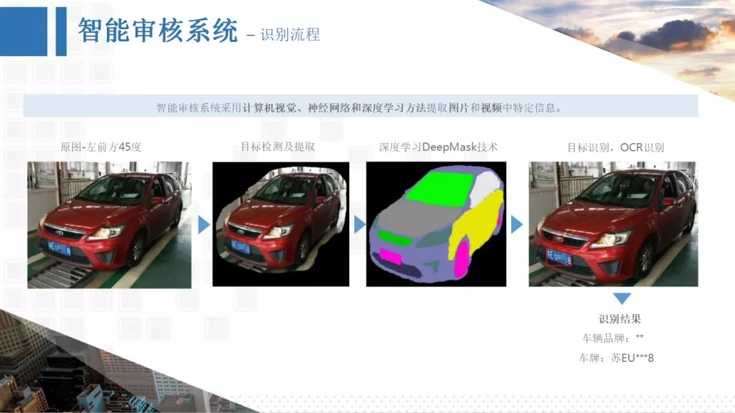 智能審核系統(tǒng)采用計(jì)算機(jī)視覺、神經(jīng)網(wǎng)絡(luò)和深度學(xué)習(xí)方法提取圖片和視頻中特定信息。先進(jìn)的人工智能算法提高了車輛檢驗(yàn)的準(zhǔn)確率,尤其人眼較難辨認(rèn)的VIN碼、格式復(fù)雜的證件表單等內(nèi)容。