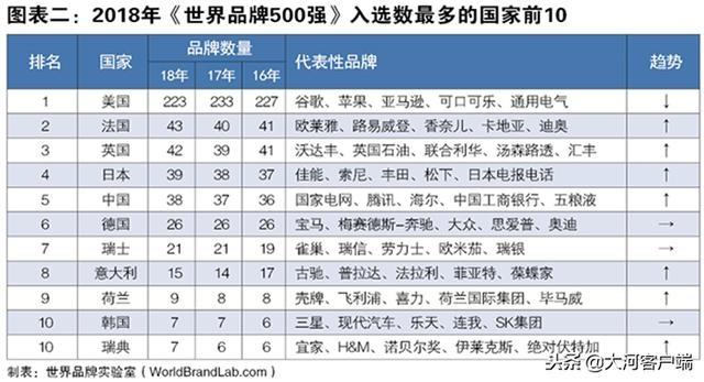 2018年《世界品牌500強(qiáng)》排行榜入選國家共計28個。從品牌數(shù)量的國家分布看,美國占據(jù)500強(qiáng)中的223席,繼續(xù)保持世界品牌第一強(qiáng)國位置;歐洲傳統(tǒng)強(qiáng)國法國和英國分別有43個和42個品牌上榜,分列二三位;日本、中國、德國、瑞士和意大利是品牌大國的第二陣營,分別有39個、38個、26個、21個和15個品牌入選。由此可見,即使歐洲經(jīng)濟(jì)低迷,但歐洲國家的超級品牌似乎依然堅挺。中國雖然有38個品牌入選,但相對于13億人口大國和世界第二大經(jīng)濟(jì)體,中國品牌顯然還處于“第三世界”。