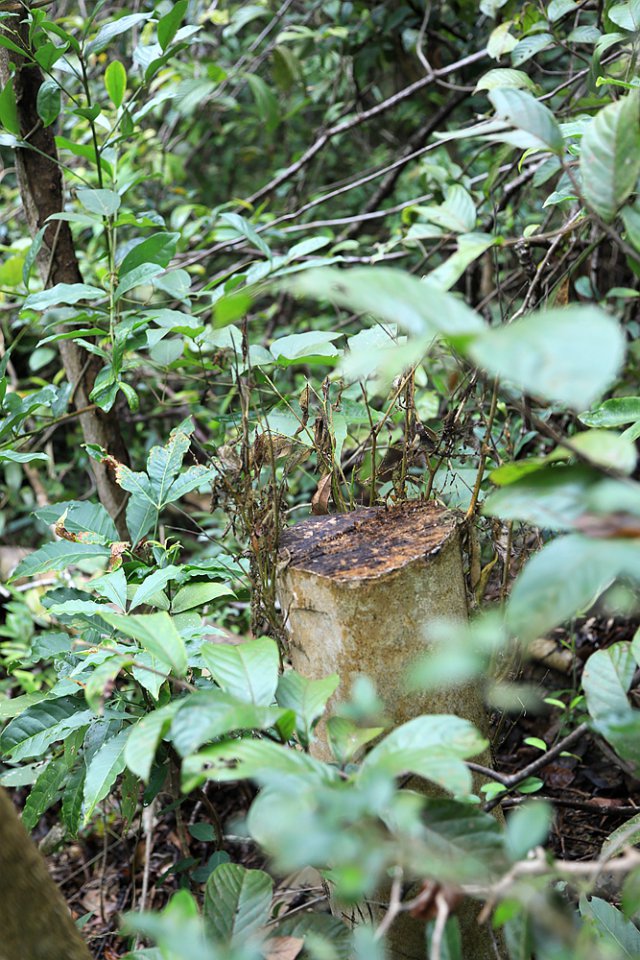 12月24日上午,記者再次來到首次發(fā)現(xiàn)盜采土沉香的地點(diǎn)。經(jīng)過近兩個(gè)小時(shí)的搜尋,在東北側(cè)山坡和溪谷中,又接連發(fā)現(xiàn)了6棵被盜伐的疑似野生土沉香。記者隨即將情況向仙湖植物園管理處副主任、植物專家張壽洲博士通報(bào)了情況,張博士告訴記者,管理處會盡快勘查現(xiàn)場,對被破壞的土沉香進(jìn)行處理。"通常情況下,被鋸斷的土沉香不會死亡,我們會根據(jù)實(shí)際情況對受損的植株采取相應(yīng)的保護(hù)措施。另外,我們會用水泥、油漆對土沉香被盜采盜伐的斷面進(jìn)行封閉處理,讓不法分子盜采不到香料。"張博士說。