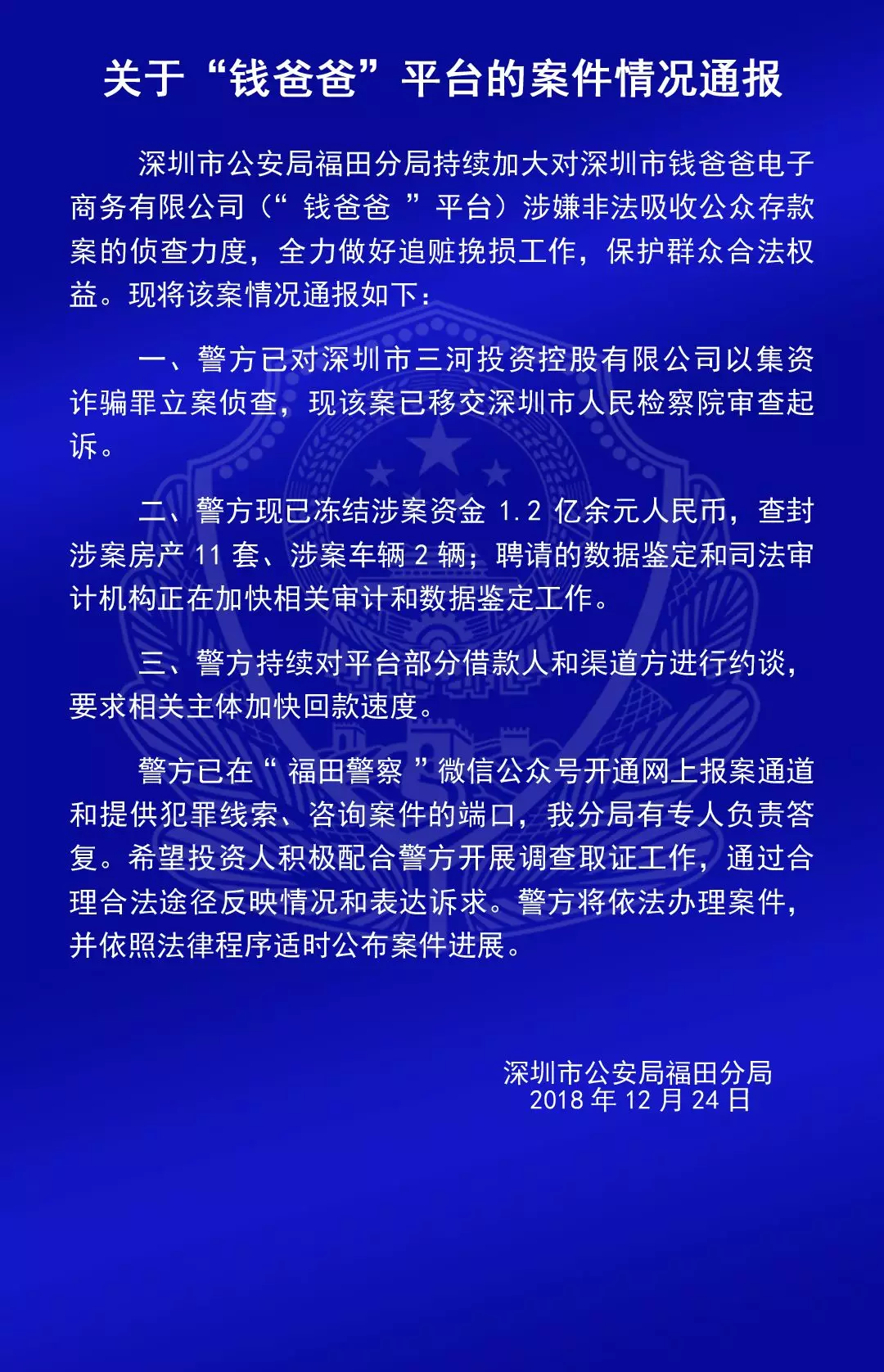 關(guān)于“合拍在線”“壹佰金融”“五星財(cái)富”“眾車在線”“財(cái)富中國”“小零錢”“錢爸爸”“合時(shí)代”和“前金融”平臺(tái)的案情通報(bào)
