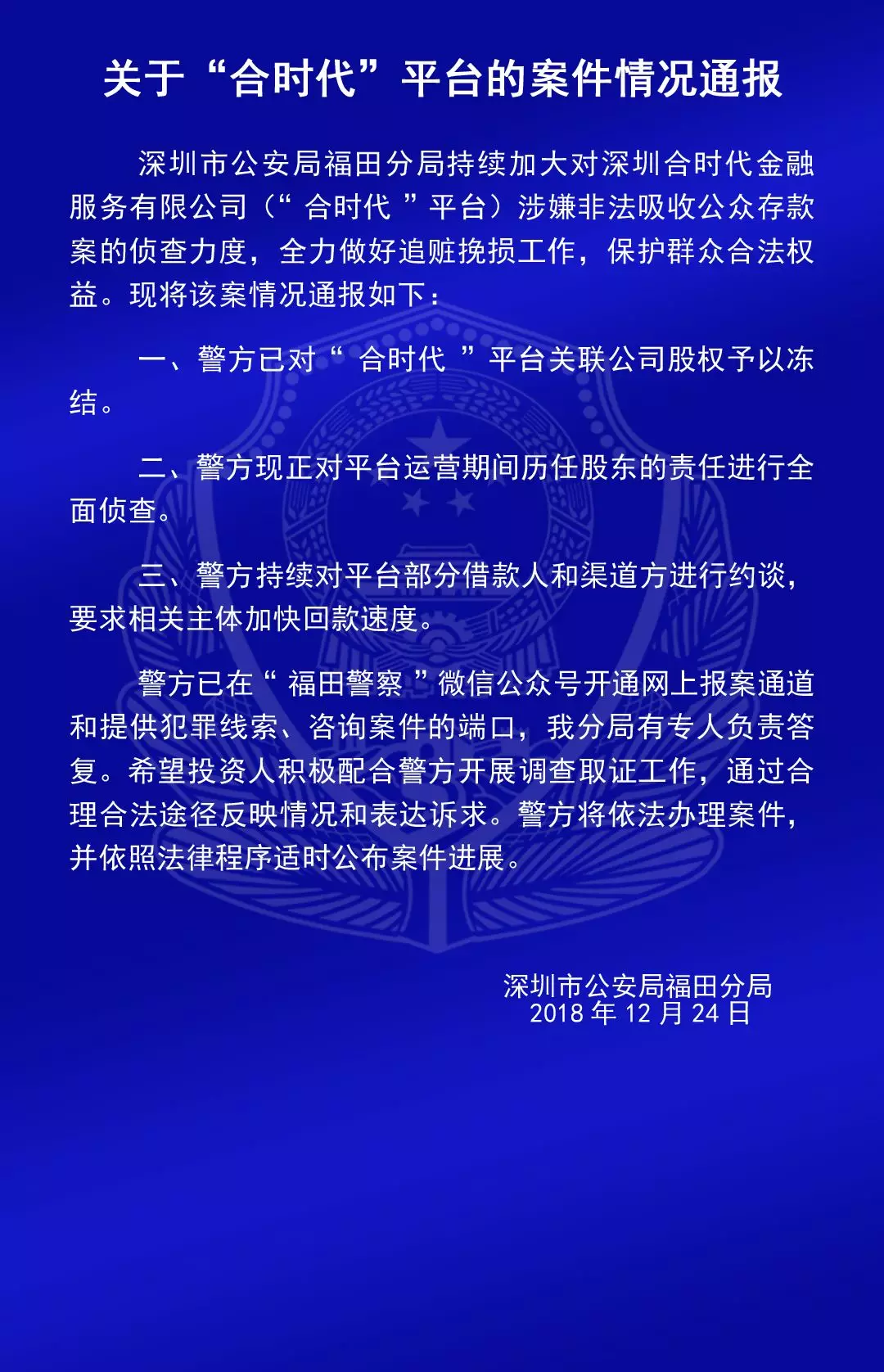 關(guān)于“合拍在線”“壹佰金融”“五星財(cái)富”“眾車在線”“財(cái)富中國(guó)”“小零錢”“錢爸爸”“合時(shí)代”和“前金融”平臺(tái)的案情通報(bào)