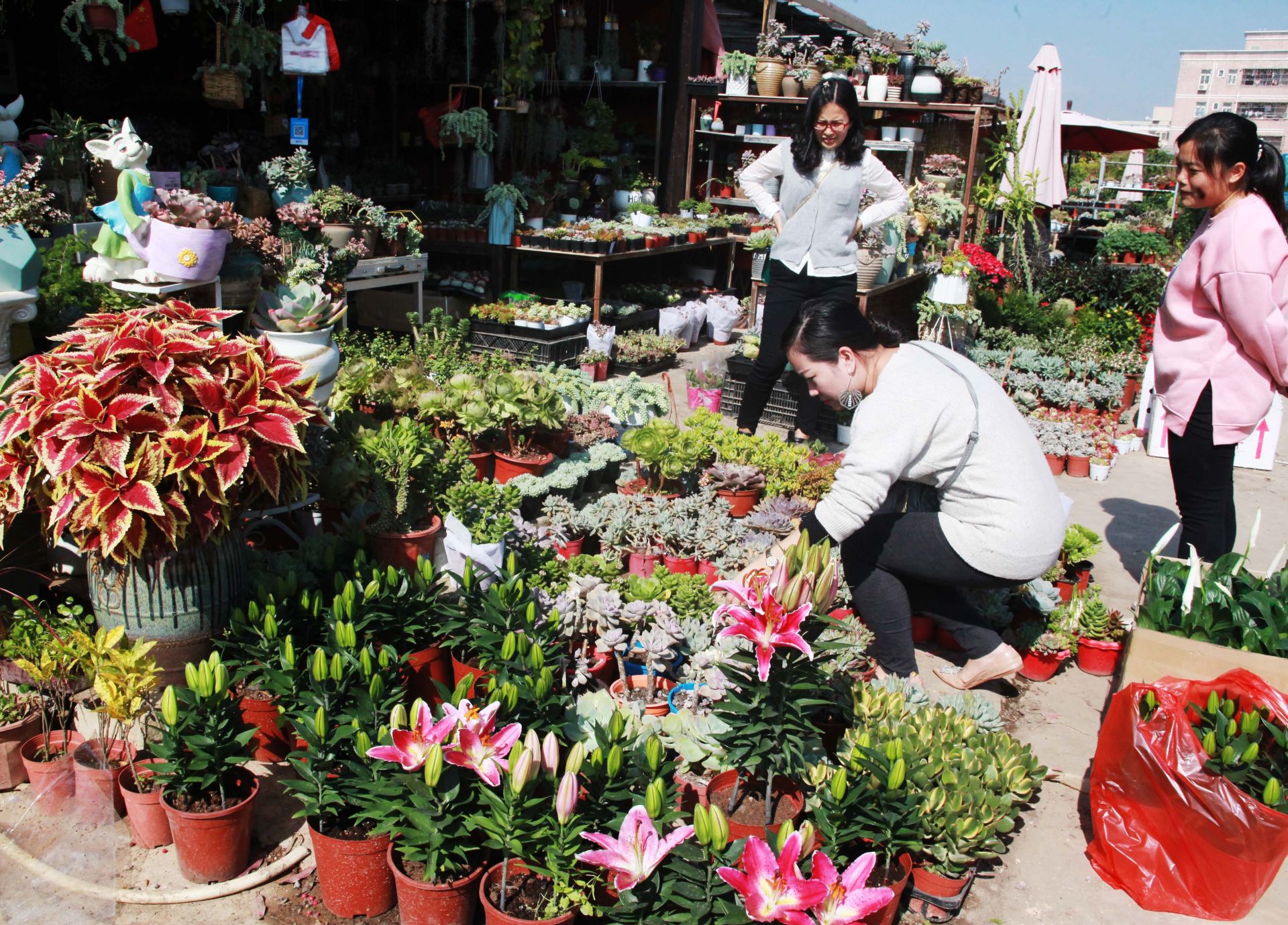 圖為市民們逛花市選購(gòu)盆景、商戶忙碌著備足鮮花迎接雙節(jié)的到來(lái)。