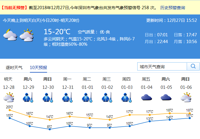 記者從深圳市氣象局了解到,27日晚上到28日白天(今日20時-明天20時)氣溫在15-20℃,空氣質(zhì)量優(yōu)-良,深圳市以多云間陰為主天;北風3-4級,陣風6-7級;相對濕度60%-80%。