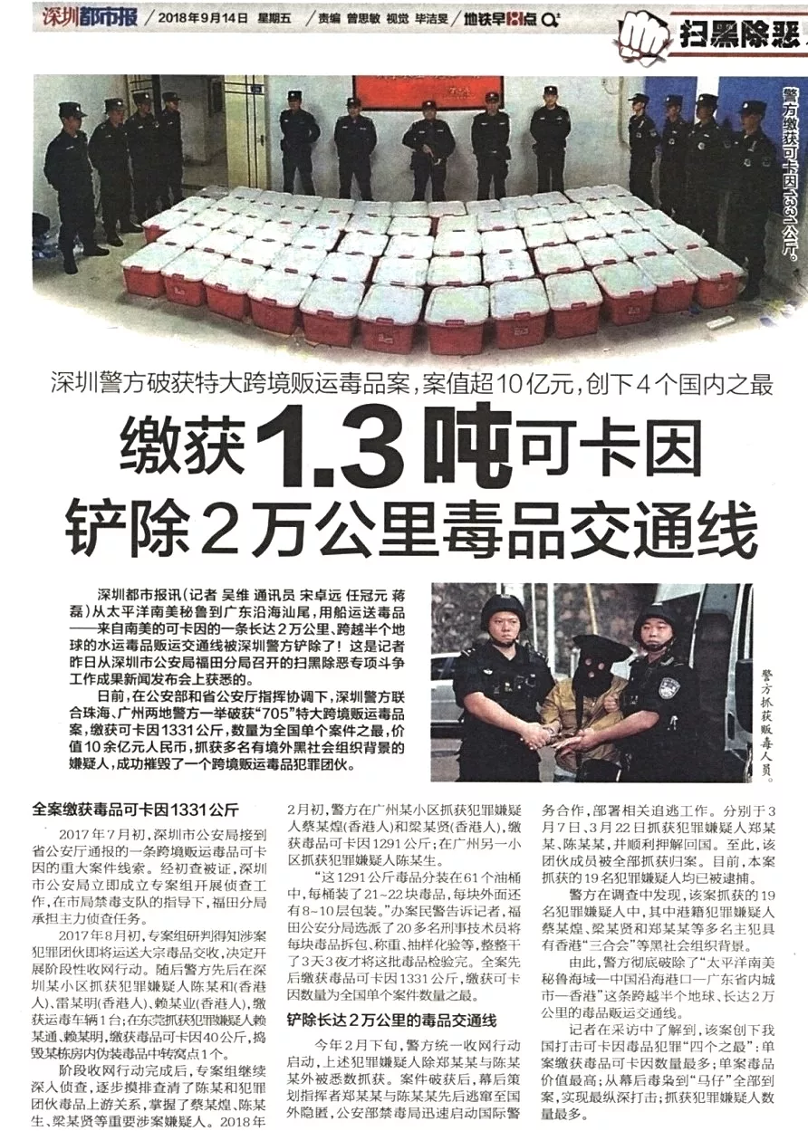 ★★在公安部和省公安廳指揮協(xié)調下,福田警方作為主力軍,聯合珠海、廣州兩地警方一舉破獲“705”特大跨境販運毒品案,創(chuàng)下我國打擊可卡因毒品犯罪“四個之最”:單案繳獲毒品可卡因數量最多;單案毒品價值最高;從幕后毒梟到“馬仔”全部到案,實現最縱深打擊;抓獲犯罪嫌疑人數量最多。