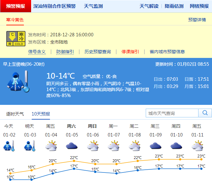 深圳新聞網(wǎng)2019年1月2日訊(記者 陳婕)記者從深圳市氣象局了解到,2日有分散小雨;9-13℃;北風3級,東部沿海和高地陣風6-7級;濕度60%-85%。預計3日持續(xù)陰冷;4-5日陰天間多云,偶有零星小雨,最低氣溫明顯回升;6日起多云到晴天,氣溫小幅波動。