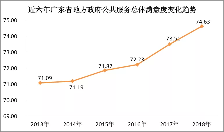深圳新聞網(wǎng)2019年1月3日訊 近日,廣東省省情調查研究中心、廣東省社會科學院績效評估中心公布了《2018年廣東省地方服務型政府建設系列調研報告》(以下簡稱“報告”),今年該調研根據(jù)“公共服務”和“營商環(huán)境”雙向維度,由“廣東省地方政府公共服務公眾評價調查”和“廣東省營商環(huán)境公眾滿意度調查”兩個調查組成。今年調查共回收有效問卷28156份,結果顯示:2018年廣東省地方政府公共服務總體滿意度得分為74.63分,較去年提高1.12分,創(chuàng)十年來最高水平。