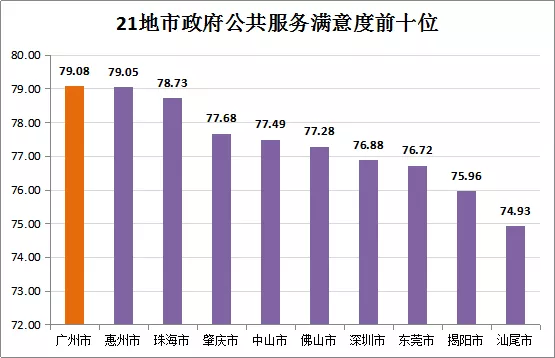 珠三角地區(qū)公共服務(wù)滿意度得分最高(77.14分),其次為粵東地區(qū)(74.55分)、粵北地區(qū)為69.79分;粵西地區(qū)得分最低,為68.34分。在21個(gè)地級以上市中,有15個(gè)地市政府公共服務(wù)總體滿意度超過70分,占全省21個(gè)地市的71.43%;總體滿意度較高的前五位依次為廣州市、惠州市、珠海市、肇慶市、中山市,均為珠三角區(qū)域城市;粵東西北滿意度較高的前五位地市依次為揭陽市、汕尾市、汕頭市、清遠(yuǎn)市、潮州市。值得注意的是,廣州十年來首次躍居全省政府公共服務(wù)滿意度第一位,作為國家中心城市,公眾的期望一直較高,取得如此成績,反映出廣州在公共服務(wù)建設(shè)上取得了長足的進(jìn)步。