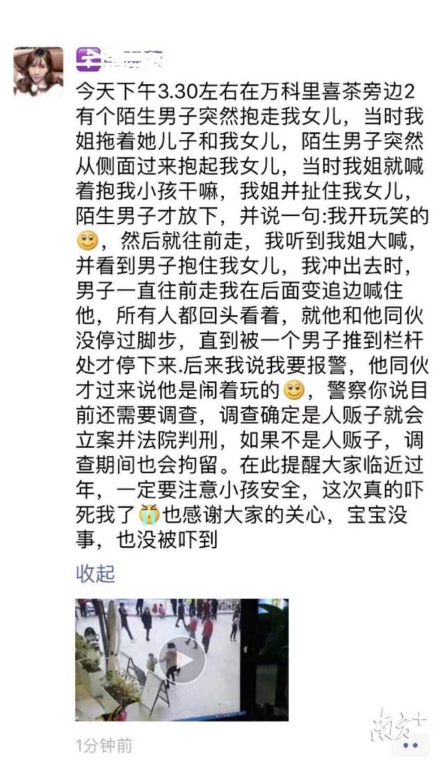 2019年1月1日下午,一位市民發(fā)朋友圈表示:在萬(wàn)科里逛街時(shí),一名陌生男子突然上前抱走她的女兒,經(jīng)過拉扯制止,該男子才放下孩子。隨后,該女士報(bào)警,而男子則表示自己是鬧著玩的。