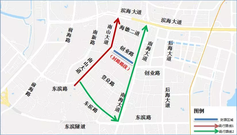 原經(jīng)南山大道轉(zhuǎn)入創(chuàng)業(yè)路東行,前往南海大道北行的車輛,可改沿南山大道北行,或經(jīng)東濱路轉(zhuǎn)入南海大道北行。