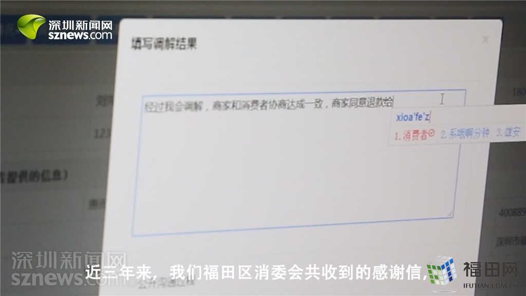 福田區(qū)消委會(huì)工作人員在315投訴平臺(tái)上填寫調(diào)解結(jié)果。