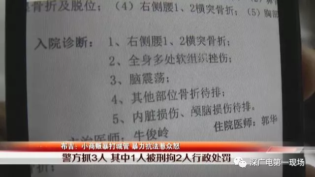 記者從中海醫(yī)院了解到,被打城管隊(duì)員徐濤右側(cè)腰兩橫突骨折。龍崗警方發(fā)通報(bào),鑒定徐濤為輕傷,以涉嫌故意傷害罪,對光頭男子趙某青采取刑事強(qiáng)制措施,同時(shí)對其妻李某玉和女老鄉(xiāng)王某,以毆打他人處以行政處罰。