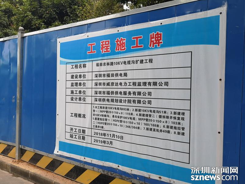 福田農(nóng)林路道路工程施工牌顯示,正在進行電纜溝擴建工程