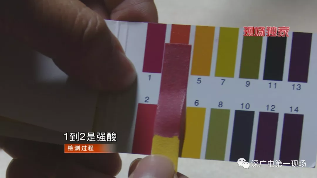 記者在地面上提取了一些廢棄液體,經(jīng)過PH試紙檢測(cè),酸性數(shù)值在1到2之間。也就是說,這些液體呈強(qiáng)酸性。