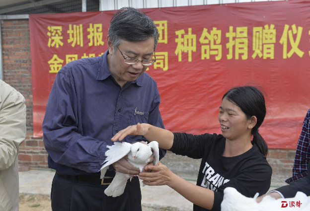 鐘仿明所在的河源市江東新區(qū)古竹鎮(zhèn)雅色村,由深圳報業(yè)集團對口幫扶,鐘仿明是村里25戶貧困戶之一。當天,深圳報業(yè)集團黨組書記、社長陳寅,集團黨組副書記、總編輯周斌,集團黨組副書記、總經(jīng)理王躍軍一行到雅色村調(diào)研扶貧情況,慰問貧困戶,親自為鐘仿明送來了種鴿。