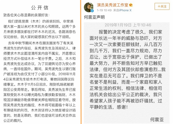 深圳新聞網1月22日訊(記者 張玲)近日,演員吳秀波婚內出軌事件再度發(fā)酵在微博引發(fā)熱搜,而這次事件的主角則是之前銷聲匿跡已久的陳昱霖(藝名)。2019年1月18日,陳昱霖父母微博公開發(fā)表聲明稱女兒被吳秀波欺騙回國后,吳秀波以“曝光隱私威脅勒索錢財”為由報警,女兒在下飛機后即被警方抓捕。隨后,吳秀波妻子何震亞發(fā)表聲明反擊,稱陳昱霖多次威脅索要巨額財務,數額一度高達千萬,在忍無可忍的情況下才選擇報警,希望通過司法途徑維護自己的權益。
