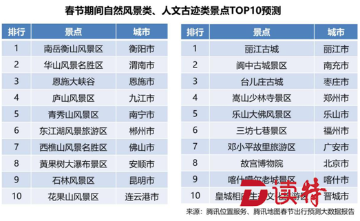 除了返鄉(xiāng)外,春節(jié)同樣是外出旅游的好時機。據(jù)《報告》預(yù)測,在全國259家5A級旅游景點中,南岳衡山風(fēng)景區(qū)、華山風(fēng)景名勝區(qū)、恩施大峽谷將排名最火爆自然風(fēng)景類景區(qū)前三,麗江古城、閬中古城景區(qū)、臺兒莊古城則是最具人氣的人文古跡類景區(qū)前三。