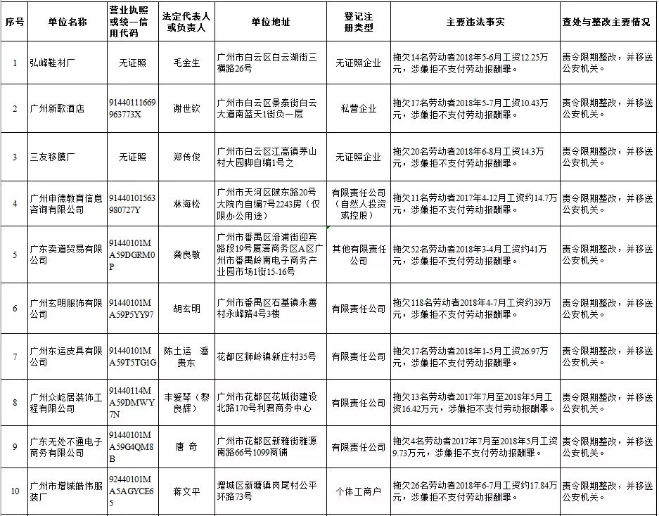 深圳新聞網(wǎng)2019年1月29日訊 (記者 劉婷)據(jù)廣東發(fā)布消息,省人社廳近日公布,2019年第一批用人單位重大勞動(dòng)保障違法行為名單。到底是哪些企業(yè)在惡意欠薪?這些“老賴”企業(yè)的營(yíng)業(yè)執(zhí)照、地址、法人等等超全信息都在這!