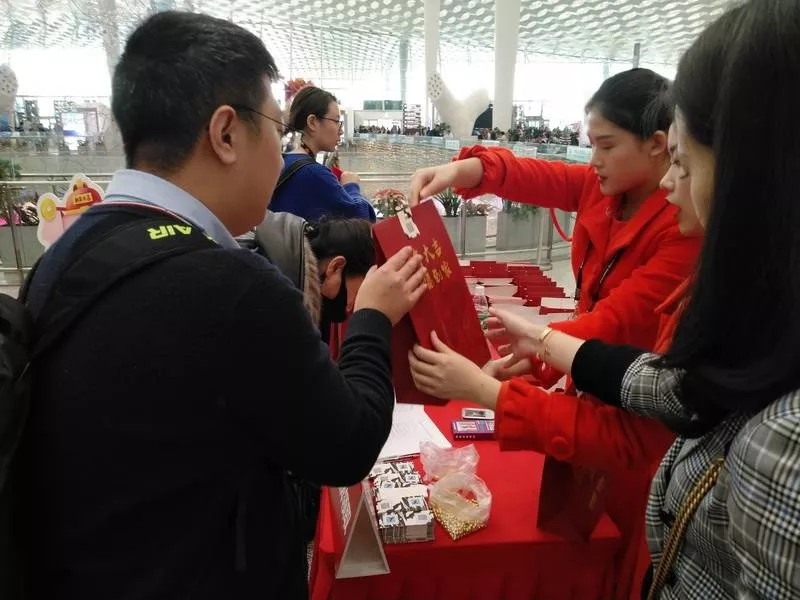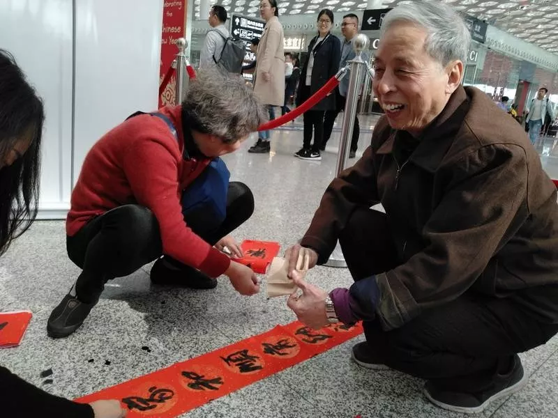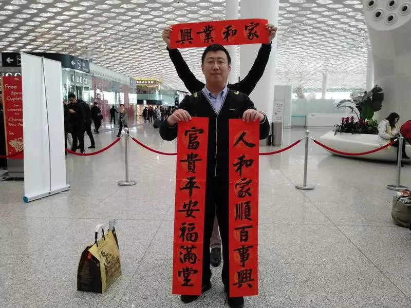 來領(lǐng)春聯(lián)的旅客里有國內(nèi)輾轉(zhuǎn)回老家的,有回國過年的,也有特地去國外過年的。來自江西婺源的曾老先生11點(diǎn)多的飛機(jī)飛往馬來西亞,今年他和老伴、孩子將在馬來西亞過年。他選的這兩幅春聯(lián)是他對新年的希望與祝福,將帶到馬來西亞貼起來,給新年增添年味兒。“我還可以送給朋友,這是最好的禮物,他們一定會(huì)喜歡的。”曾先生高興地說。