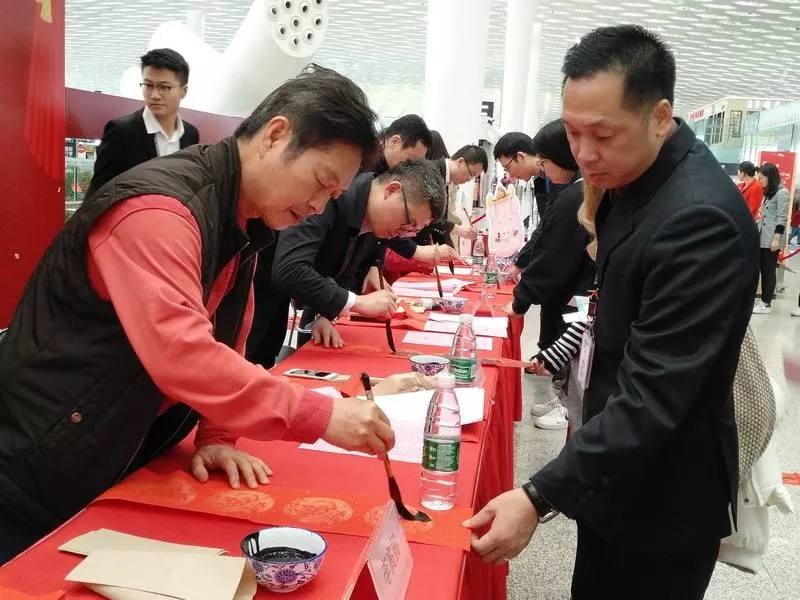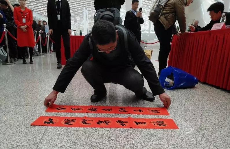 ▲旅客們請書法家們寫春聯(lián),把“福”帶回家!