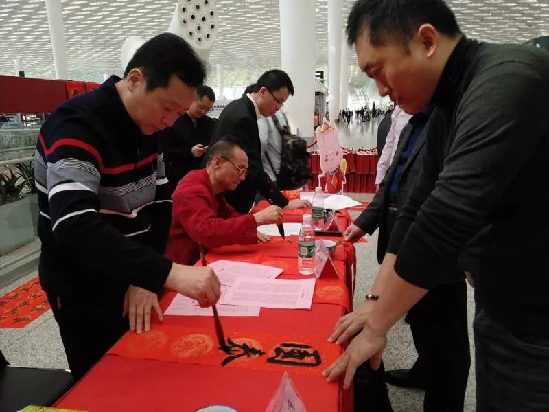 寶安區(qū)書法家協(xié)會(huì)主席李高揚(yáng)介紹,在機(jī)場送春聯(lián)很有意義,可以給全國各地的朋友們送上新年祝福。這次深圳發(fā)布廳攜手深圳機(jī)場舉辦活動(dòng),寶安區(qū)書法家協(xié)會(huì)集結(jié)高手出動(dòng)為群眾服務(wù),為市民送去祝福。他祝大家新春快樂,闔家幸福。