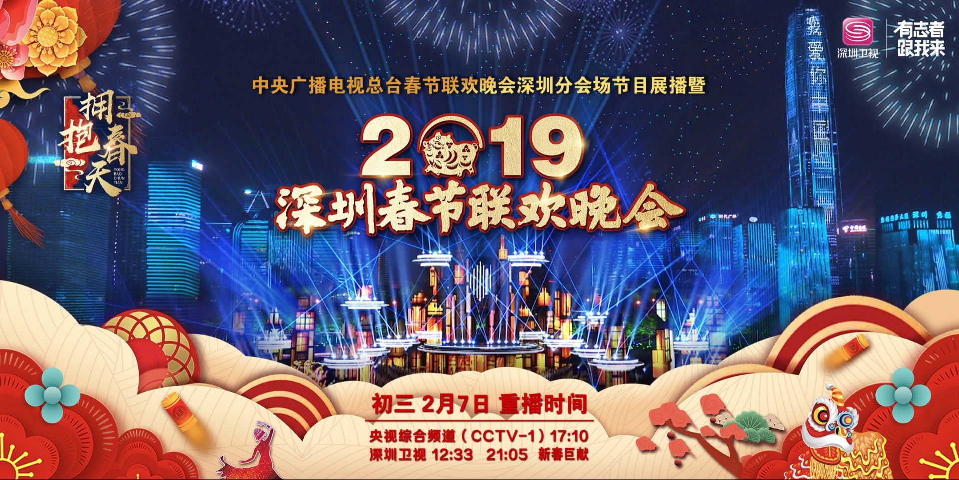 圳特區(qū)報(bào)2019年02月07日訊 央視春晚深圳分會(huì)場(chǎng)完整版《擁抱春天——深圳春節(jié)聯(lián)歡晚會(huì)》于2月6日(大年初二)在央視三套(綜藝頻道)和深圳衛(wèi)視首播后,獲得了廣泛而熱烈的社會(huì)好評(píng)。為了讓廣大觀眾更充分的欣賞這場(chǎng)充滿現(xiàn)代感和未來(lái)感的晚會(huì),央視和深圳衛(wèi)視將于以下時(shí)間為您重播晚會(huì):