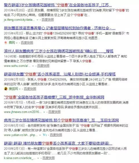 在網(wǎng)上搜索"寧繼春",就會(huì)發(fā)現(xiàn)這其實(shí)是一則不折不扣的假消息。從2014年起,全國各地就傳出錦繡花園小區(qū)"丟孩子"的網(wǎng)絡(luò)謠言,還有10萬元"重謝"的承諾。